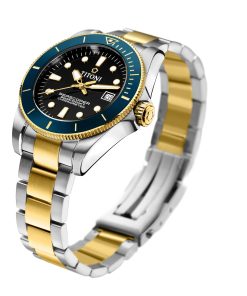 The new Titoni Seascoper 300 Bicolor blends rugged dive watch performance with a refined, sophisticated design, a balance that will appeal to the discerning enthusiast. Under the stewardship of Marc and Olivier Schluep, the fourth generation of Titoni’s founding family, the Seascoper 300 has been reimagined with an elegant flair. The Seascoper 300’s golden Luminova-filled hands and black lacquered dial stand out at first glance, while the textured ceramic bezel, available in a trio of color options, offers both beauty and function. There’s also a choice between two bracelet designs, one featuring gold-plated center links and one in stainless steel.