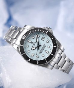 Designed for diving enthusiasts, the ceramic bezel of the SEASCOPER 300 – ICE BLUE has a bright white dive time scale, including a prominent signal triangle at 12 o’clock for optimal readability. The bezel’s anti-clockwise rotation capability, coupled with serrated edges, facilitates effortless adjustment of dive time, even in challenging conditions.