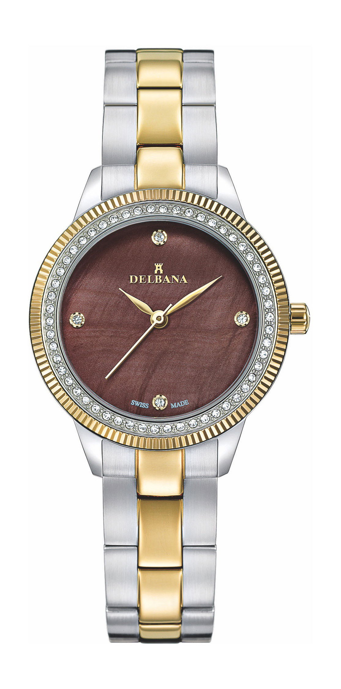 Available in either polished 32 mm stainless steel or a resplendent two-tone yellow gold IPG, the case of this collection is a testament to Delbana’s commitment to affordable luxury. The bezel is gracefully set with 60 Swarovski crystals. Further enhancing its elegance is a solid bracelet that seamlessly blends both polished and brushed finishes, allowing the watch to transition effortlessly from day to night. The dial showcases an elegant 3-hand configuration, shimmering crystal set indexes, and leaf-shaped hands, available in stainless steel or yellow gold IPG.