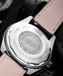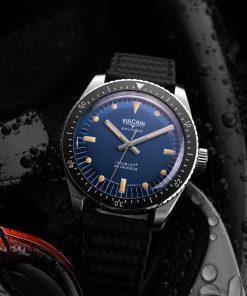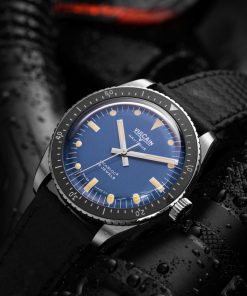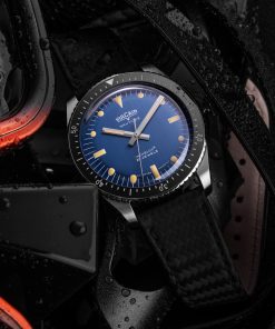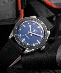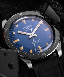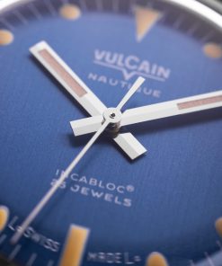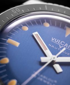 The Vulcain Skindiver Nautique Blue, inspired by a 1960 Vulcain model, is a vintage-styled diver’s watch. It features ETA’s 2824 three-hand Swiss automatic caliber with a 38-hour power reserve. Designed for underwater use, it has a 38mm stainless steel case, is water-resistant up to 200 meters, and includes ultra-legible khaki brown Super-Luminova-enhanced hands and indexes for low-light conditions. The Skindiver Blue also has a unidirectional fluted bezel with a black ceramic insert and contrasting white markers. Its matte blue dial includes a white minute track and signature, and it comes with a quick-change leather strap.