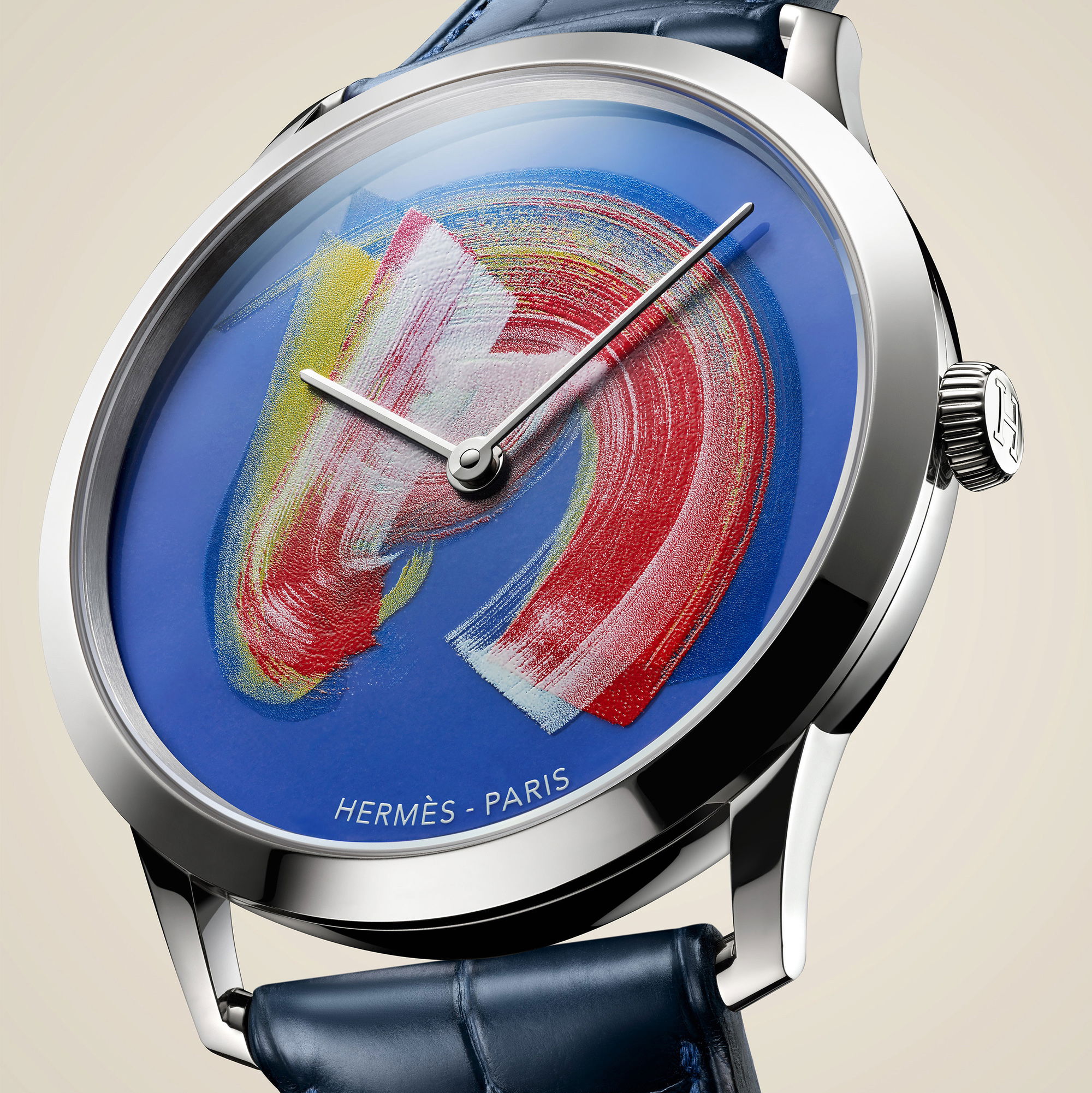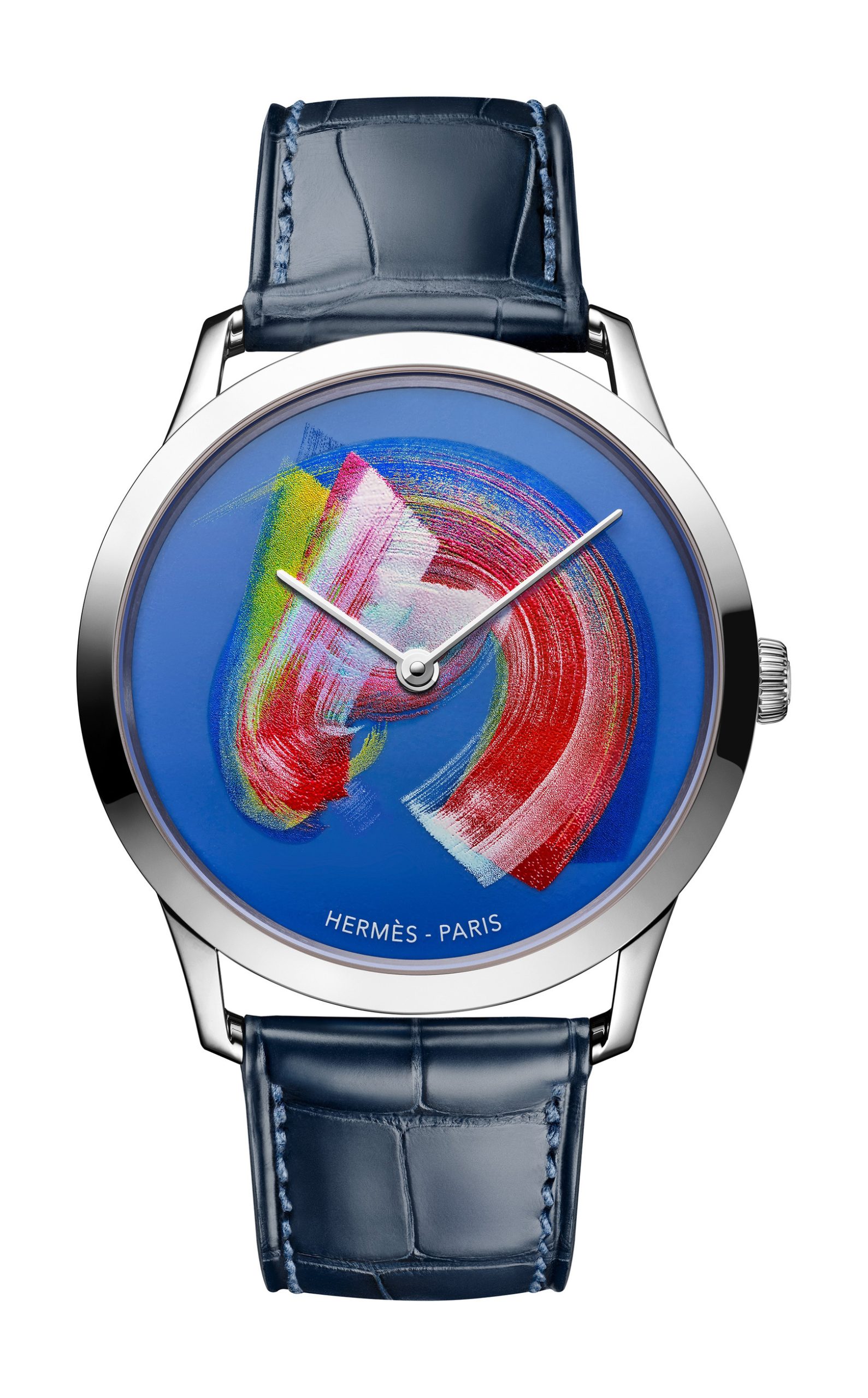 Powering this timepiece is the ultra-thin H1950 self-winding movement, manufactured within the Manufacture Hermès workshops. Its elegant architecture, barely there yet profoundly present, ensures that timekeeping remains as flawless as the watch’s artistry. Complementing the dial, a matt Bleu Abysse alligator strap—a testament to Hermès’ leatherworking—anchors the composition, harmonizing the watch’s vivid palette. The Slim d’Hermès Cheval brossé is limited to 24 pieces.