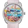 The dial becomes a universe of floating curiosities, like an open bag, horseshoe, headphones, and vintage phone receiver, all painted with remarkable finesse. Manufactured through the combined techniques of engraving and miniature painting on an appliqué, the dial’s depth is enhanced by a sparkling aventurine base and a sapphire ring that houses the levitating objects.