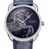 The Slim d’Hermès Flagship is a masterpiece of metiers d’Arts, where know-how meets poetic storytelling. In true Hermès fashion, this limited edition watch, with only 12 pieces available, pays homage to the brand’s iconic roots. The dial, a striking mix of miniature painting and engraving, captures the majestic Hermès ship sailing beneath a starry aventurine sky. Its hull, inspired by the legendary Parisian boutique at 24 Rue du Faubourg Saint-Honoré, is brought to life by skilled artisans, reflecting the whimsical elegance for which Hermès is known.