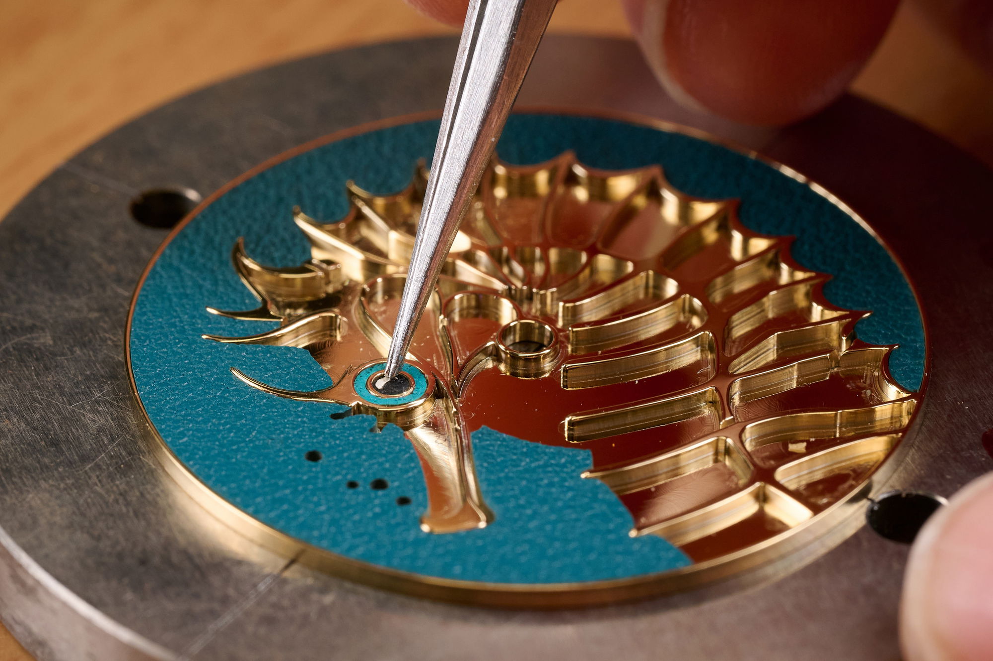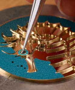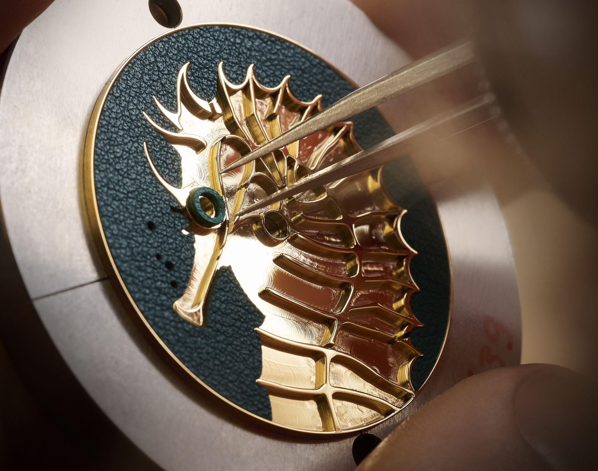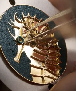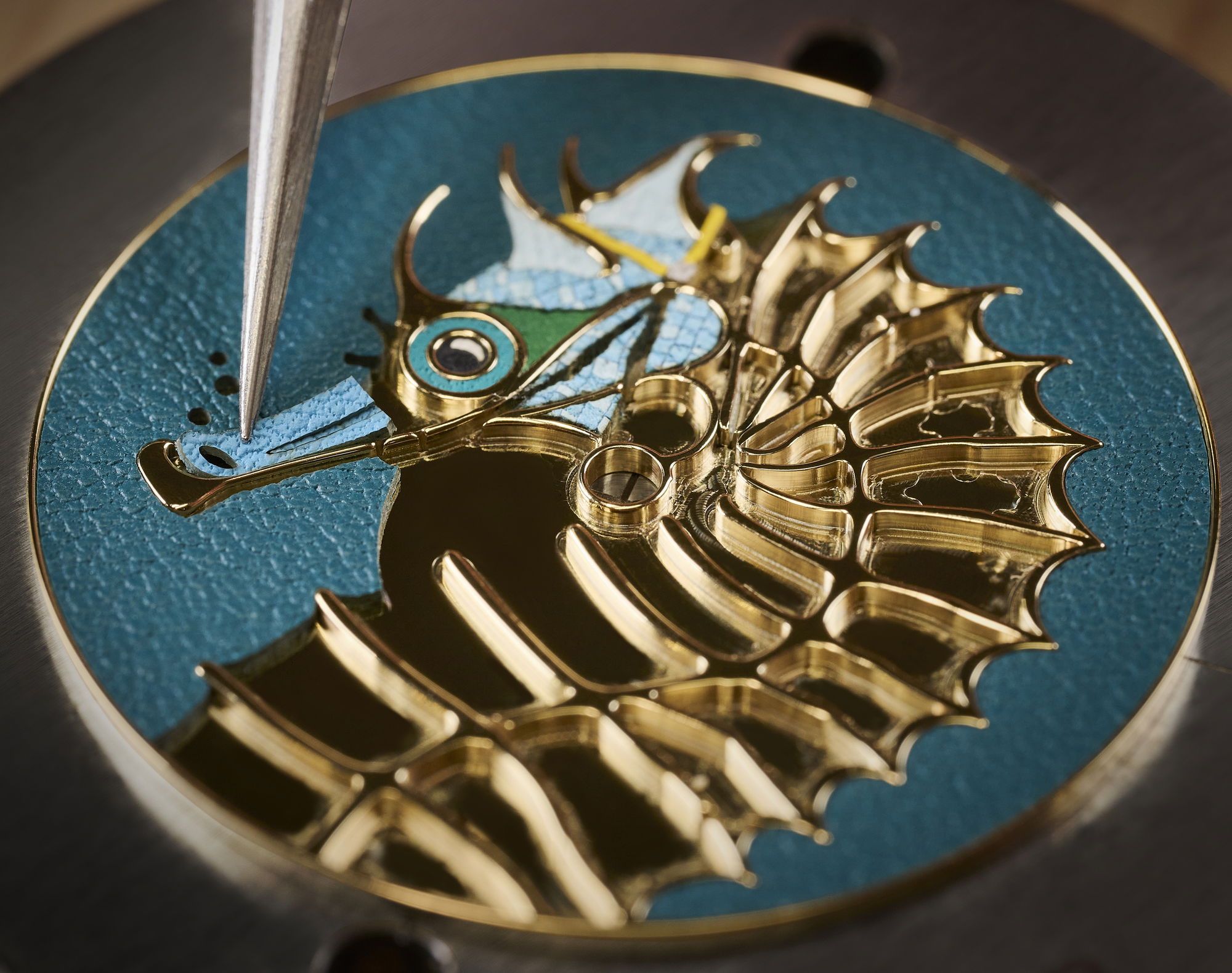 To transpose the seahorse to dial scale, the engraver begins by mapping its outline and drawing out its curves with a selection of precision tools. The marquetry artisan then prepares ultra thin calfskin, trimmed to just half a millimetre, before cutting it into tiny coloured elements. Each fragment is placed by hand, slotting into the engraved relief until the seahorse gradually emerges with texture and depth.