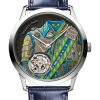 Hermès brings together two of its signature crafts to make this happen. The engraver first sculpts the outlines of the jacket into the metal, before the miniature painter breathes colour and depth into every fold and trim. The dial sits inside a 39.5 mm platinum case, its clean geometry untouched despite the intricate decoration.