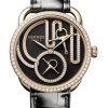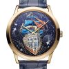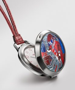 Limited to just three pieces, this pocket watch reinterprets the Mysterious Rider silk scarf motif by Viktor Hachmang, known for his fusion of Japanese art, comic-book pop culture, and futuristic graphics. The watch’s cover depicts a colorful rider on a motorbike against a backdrop reminiscent of 24 Faubourg Saint-Honoré in Paris, created using the intricate champlevé enamel technique.
