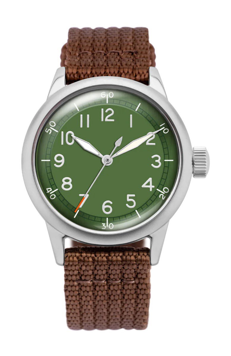 Completing the field watch look, the straps are available in durable drab green canvas or brown nylon, built tough to withstand humidity, sweat, and the elements. This watch is both a tribute to history and a modern, rugged timepiece.