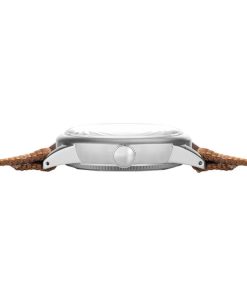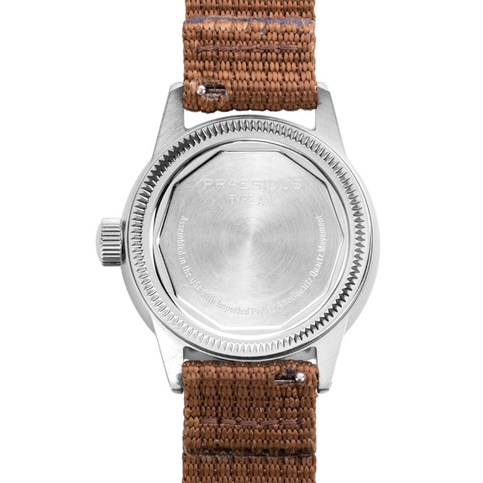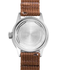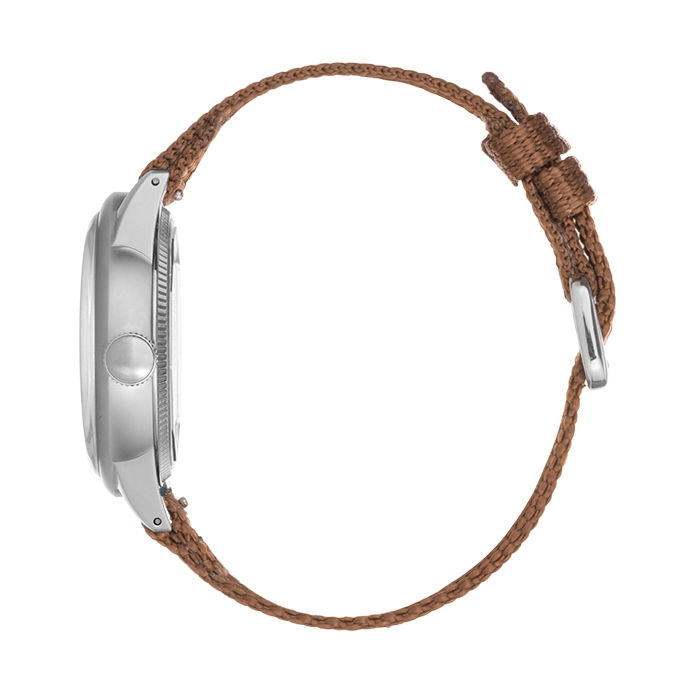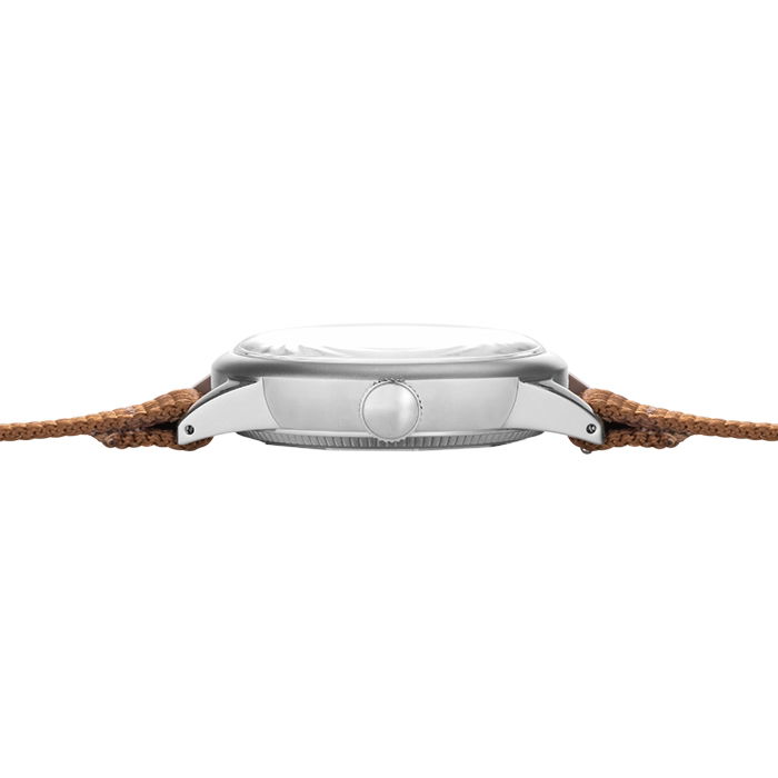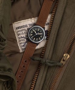 The Brown tressed Nylon strap strongly emphasizes the original field watch look while giving it a more rugged appearance. The Nylon tressing adds thickness to the watch, enhancing its robust feel (you’ll notice it on your wrist as it breaks in!) and bringing it into the modern era post-WW2.