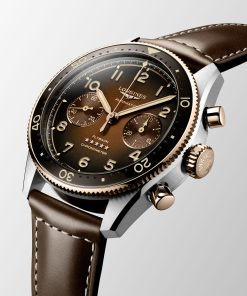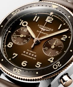 This timepiece features a shaded matte brown dial, complemented by a cap, crown, and pushers crafted from 18-carat yellow gold. Its exclusive Longines movement, certified as a chronometer by the COSC (Contrôle Officiel Suisse des Chronomètres), offers a power reserve of up to 68 hours. The self-winding mechanical movement includes a silicon balance-spring and advanced components, making it ten times more resistant to magnetic fields than the ISO 764 standard.