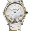 Women’s EBEL Sport Classic watch, stainless steel and 18K rose gold case, Ø 29.0mm, silver dial with 4N rose gold-plated Roman numerals and 8 diamonds (0,052cts), sapphire crystal with antireflective treatment underneath, two-tone stainless steel wave link bracelet with a deploying buckle, Swiss automatic movement.