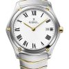 Men’s EBEL Sport Classic watch, stainless steel case, Ø 40mm, Blue galvanic dial with kissing E stamped pattern and rhodium plated Roman numerals, sapphire crystal with antireflective treatment underneath, stainless steel wave link bracelet with a folding clasp, Swiss automatic movement, water-resistant up to 50 meters