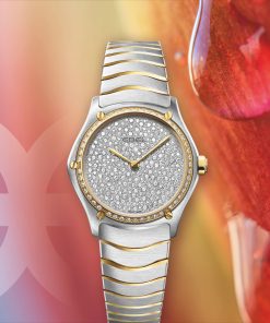 Women’s EBEL Sport Classic watch, stainless steel and 18K yellow gold case with 47 diamonds (0.3055ct), Ø 29mm, pavé diamonds dial, 225 diamonds (0.507ct), sapphire crystal with antireflective treatment underneath, two-tone stainless steel wave link bracelet with a folding clasp, Swiss quartz movement, limited edition 200 pieces, water-resistant up to 5 bar