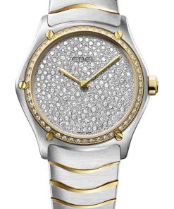 Women’s EBEL Sport Classic watch, stainless steel and 18K yellow gold case with 47 diamonds (0.3055ct), Ø 29mm, pavé diamonds dial, 225 diamonds (0.507ct), sapphire crystal with antireflective treatment underneath, two-tone stainless steel wave link bracelet with a folding clasp, Swiss quartz movement, limited edition 200 pieces, water-resistant up to 5 bar