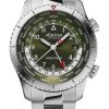 The Worldtimer function is displayed on the outermost circle of the dial, showing 24 time zones with reference cities. The red-tipped central hand can be synchronized with the selected time zone using a dedicated crown. The Startimer Pilot Quartz Worldtimer is available in green, blue, or black dials with a steel case.