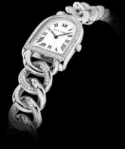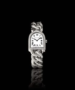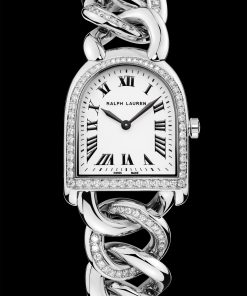The Ralph Lauren Stirrup Petite-Link, particularly tailored for the female wrist, features a 23.30mm by 27mm stainless steel case and a bracelet design inspired by jewelry, made of intertwined links with diamonds, offering comfort and elegance. The case and bracelet are set with 84 stones (~0.72 Ct). These timepieces, with their unique stirrup silhouette and detailed craftsmanship, including a chain-link bracelet, a white lacquered and polished dial with black Roman numerals, minute markers, sword-shaped hands, and a curved sapphire crystal, underscore Ralph Lauren’s philosophy of women’s watches as pieces of jewelry and heirlooms.