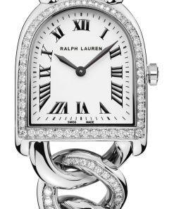 The Ralph Lauren Stirrup Petite-Link, particularly tailored for the female wrist, features a 23.30mm by 27mm stainless steel case and a bracelet design inspired by jewelry, made of intertwined links with diamonds, offering comfort and elegance. The case and bracelet are set with 84 stones (~0.72 Ct). These timepieces, with their unique stirrup silhouette and detailed craftsmanship, including a chain-link bracelet, a white lacquered and polished dial with black Roman numerals, minute markers, sword-shaped hands, and a curved sapphire crystal, underscore Ralph Lauren’s philosophy of women’s watches as pieces of jewelry and heirlooms.