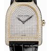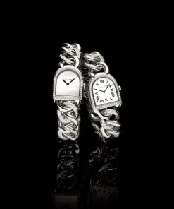 The Ralph Lauren Stirrup Petite-Link Mother of Pearl watch revitalizes a bold design that debuted fifteen years ago. It features a polished stirrup-shaped steel case measuring 23.3 by 27 mm and a height of 6.7 mm, adorned with 56 brilliant-cut white diamonds (0.41 ct) around the outer edge. The white mother-of-pearl dial, protected by a curved sapphire crystal, showcases glossy black sword-type hands for hours and minutes. The bracelet, also polished steel, includes 84 brilliant-cut diamonds (0.72 ct), blending the classic stirrup design with high jewelry elegance. The Swiss-manufactured movement, caliber 976.001, offers quartz precision and a battery life of at least 74 months.