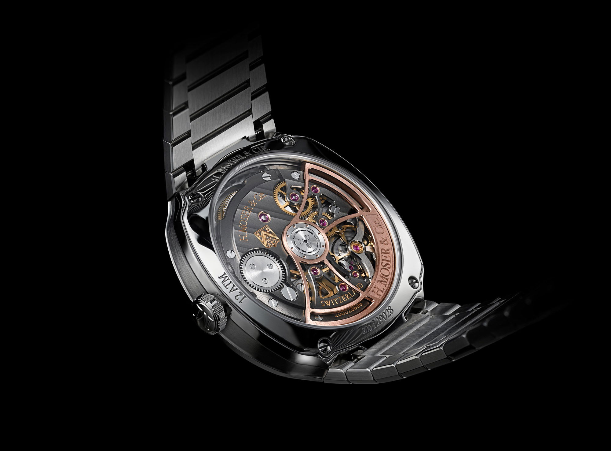 The watch is powered by the HMC 201 self-winding calibre, which updates the previous HMC 200. It features a wider opening with partially skeletonized bridges, an anthracite grey finish, and a bevelled rotor, allowing a clear view of the mechanism while maintaining a 3-day power reserve.