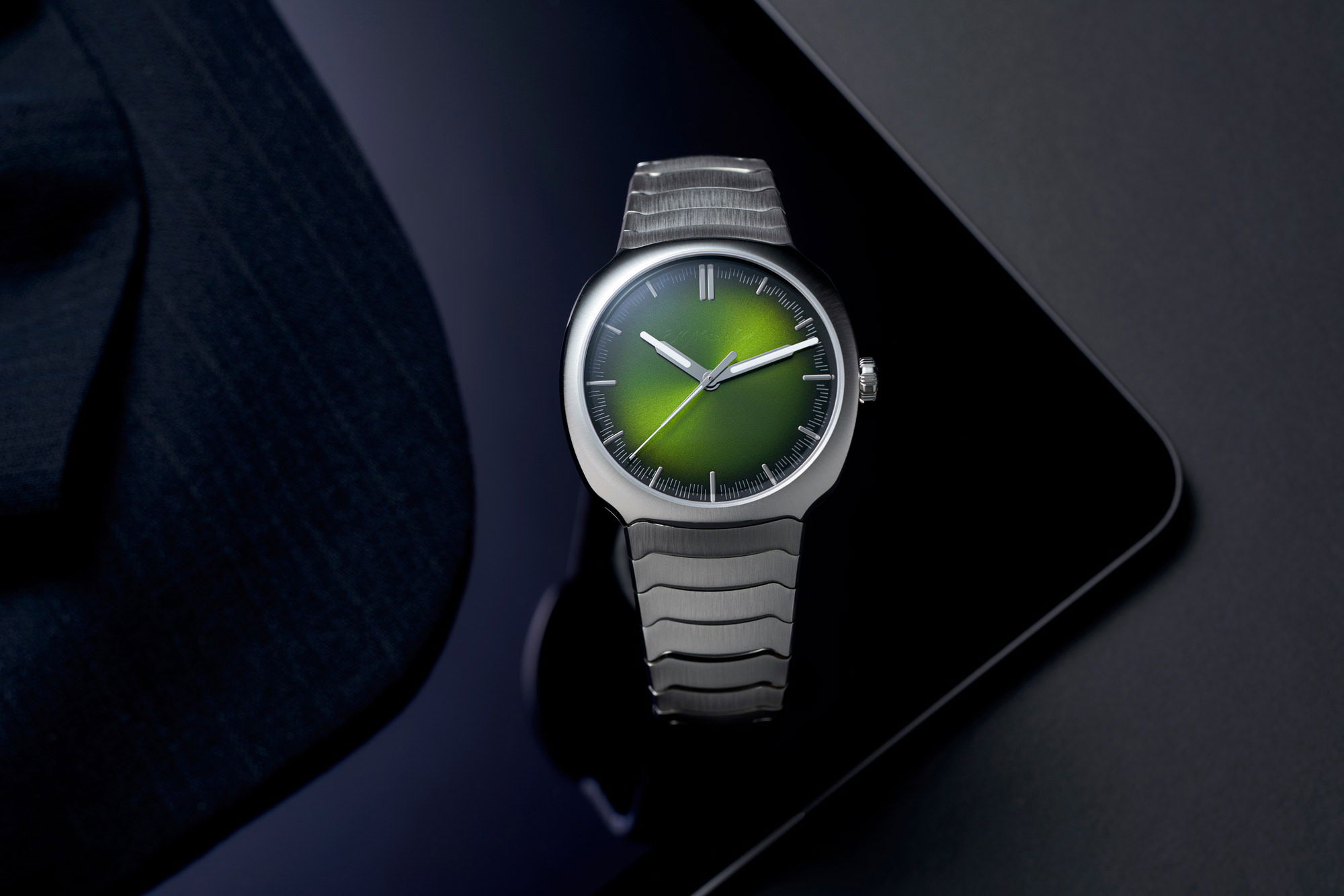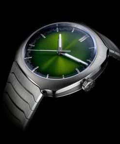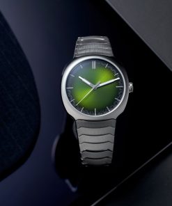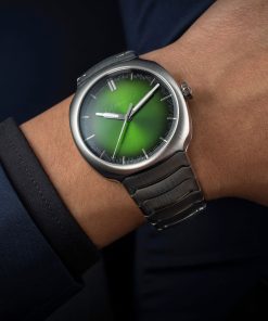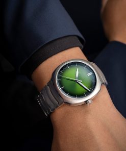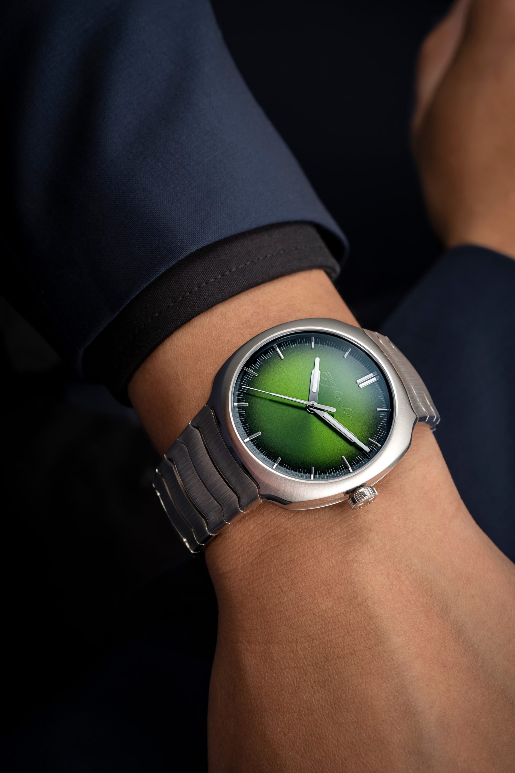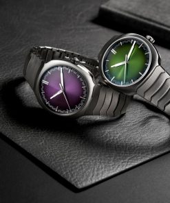 The Matrix Green fumé dial, with its vibrant palette from olive green to red gold, complements the elegance of the case. The new “Purple Haze” dial offers an intense purple with blue reflections. Both dials feature the brand’s transparent lacquer logo and 3D hands with Globolight® inserts containing Super-LumiNova®.