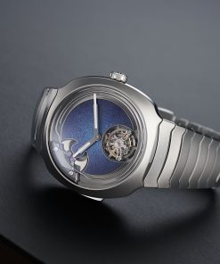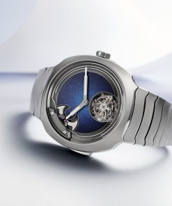 The cushion-shaped steel case is engineered to maximize sound quality. Its widened middle accommodates the movement and creates a soundbox that amplifies the chiming mechanism. The flying tourbillon at 6 o’clock, supported by a skeletonized bridge, appears to float on the dial. The dial’s ombré effect is achieved through Grand Feu enameling, resulting in a unique Aqua Blue finish free of logos or indices.