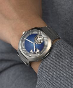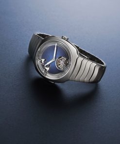 H. Moser & Cie. introduces the Streamliner Concept Minute Repeater Tourbillon Blue Enamel. This watch features a water-resistant case (up to 5 ATM) and a minute repeater complication. Here, the hammers and gongs perform in harmony with a one-minute flying tourbillon positioned at 6 o’clock. The Aqua Blue dial, crafted from “Grand Feu” enamel with a hammered texture.