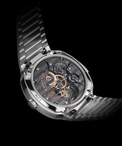 This watch merges the classic minute repeater complication with a modern flying tourbillon, creating a unique design that positions the gongs and hammers on the dial. This bold decision maintains both ergonomic and design balance, complemented by an elegantly curved integrated steel bracelet that follows the wrist’s natural line.
