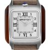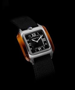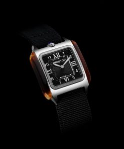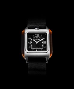 The Streamliner Kennedy Medium offers a balanced take on Briston’s new square design, tailored for smaller wrists while preserving the architecture of the larger models. Measuring 30 millimeters, the case blends polished steel and tortoiseshell acetate side panels for a subtle contrast of materials. The crown is positioned at 12 o’clock and set with a lapis lazuli cabochon, a signature touch across the collection. The dial features a double-layer structure with stamped Roman or Arabic numerals, a guilloché-finished center, and a railway-style minute track that frames the design with precision.