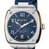 The dial carries the weight of the design, with an embossed waffle texture that adds depth without distracting from legibility. Arabic numerals, drawn from Briston’s Clubmaster line, are carved into the dial alongside simple indexes. Colour options span from ice blue and navy to olive and taupe, each dial marked by a square-outlined date window and the understated “Automatic” label at six.