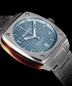 The dial carries the weight of the design, with an embossed waffle texture that adds depth without distracting from legibility. Arabic numerals, drawn from Briston’s Clubmaster line, are carved into the dial alongside simple indexes. Colour options span from ice blue and navy to olive and taupe, each dial marked by a square-outlined date window and the understated “Automatic” label at six.