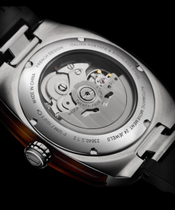 Briston’s Streamliner Urban Automatic quietly refines the brand’s design language with a case that blends tonneau curves and integrated lines. The visible screws on the bezel remain, a subtle nod to functionality, while the tortoiseshell acetate case is balanced by brushed and polished surfaces. Inside, the NH35 automatic movement offers a practical 41-hour power reserve and can be seen through the transparent case back, complete with a rotor finished in Côte de Genève.