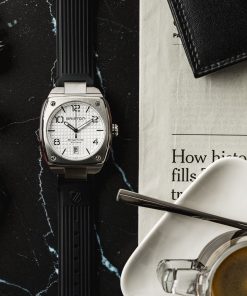 The dial carries the weight of the design, with an embossed waffle texture that adds depth without distracting from legibility. Arabic numerals, drawn from Briston’s Clubmaster line, are carved into the dial alongside simple indexes. Colour options span from ice blue and navy to olive and taupe, each dial marked by a square-outlined date window and the understated “Automatic” label at six.