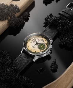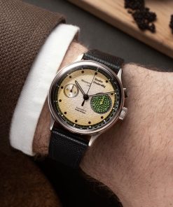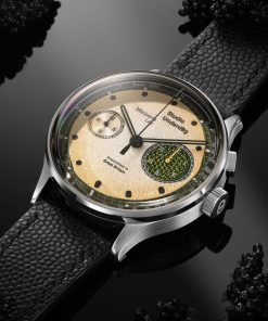 The dial pairs the golden shimmer of champagne with the glossy depth of caviar, anchored by an oversized “big-eye” subdial that cleverly evokes a tin of roe. A champagne-bottle silhouette sits at the base of the chronograph hand, an irreverent detail that rewards a closer look. It’s indulgent but not gaudy, balanced by co-branding symmetry and a beautifully soft pebble-grain calfskin strap from The Strap Tailor.