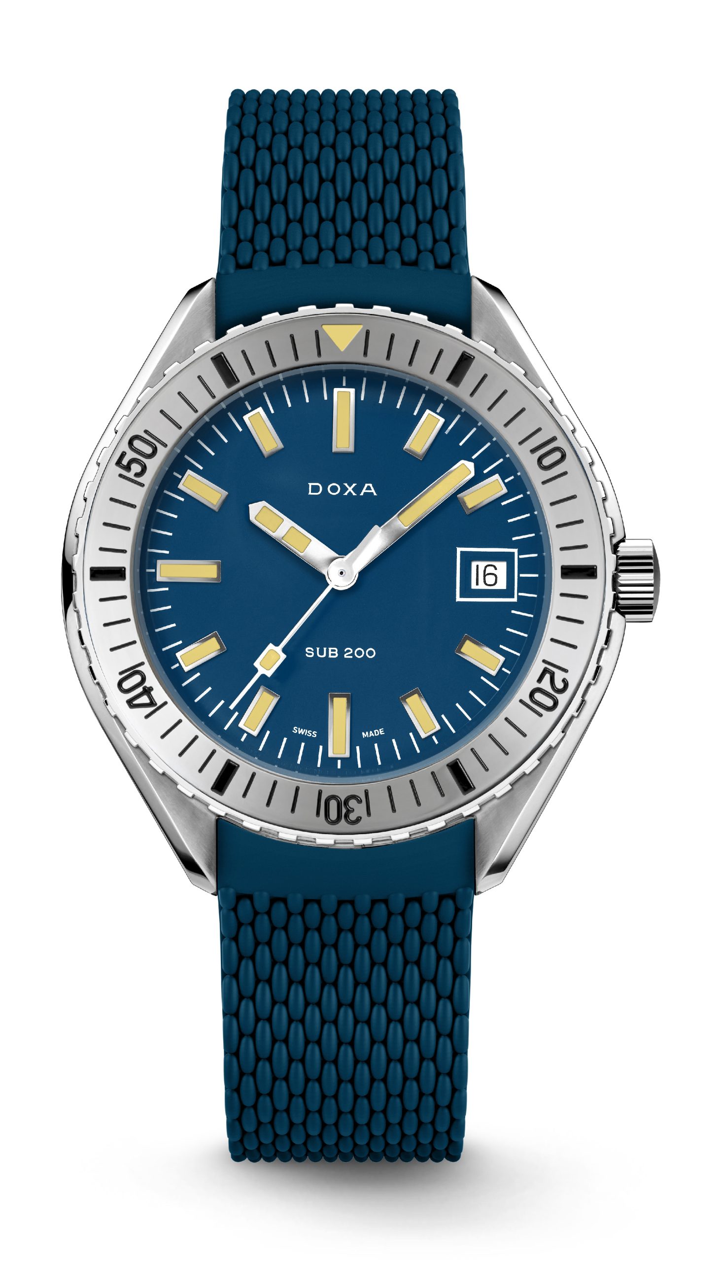 Available across all eight signature DOXA colorways, the new SUB 200 arrives on rubber, classic beads-of-rice stainless steel, or a NATO strap (exclusively for the Sea Emerald edition).