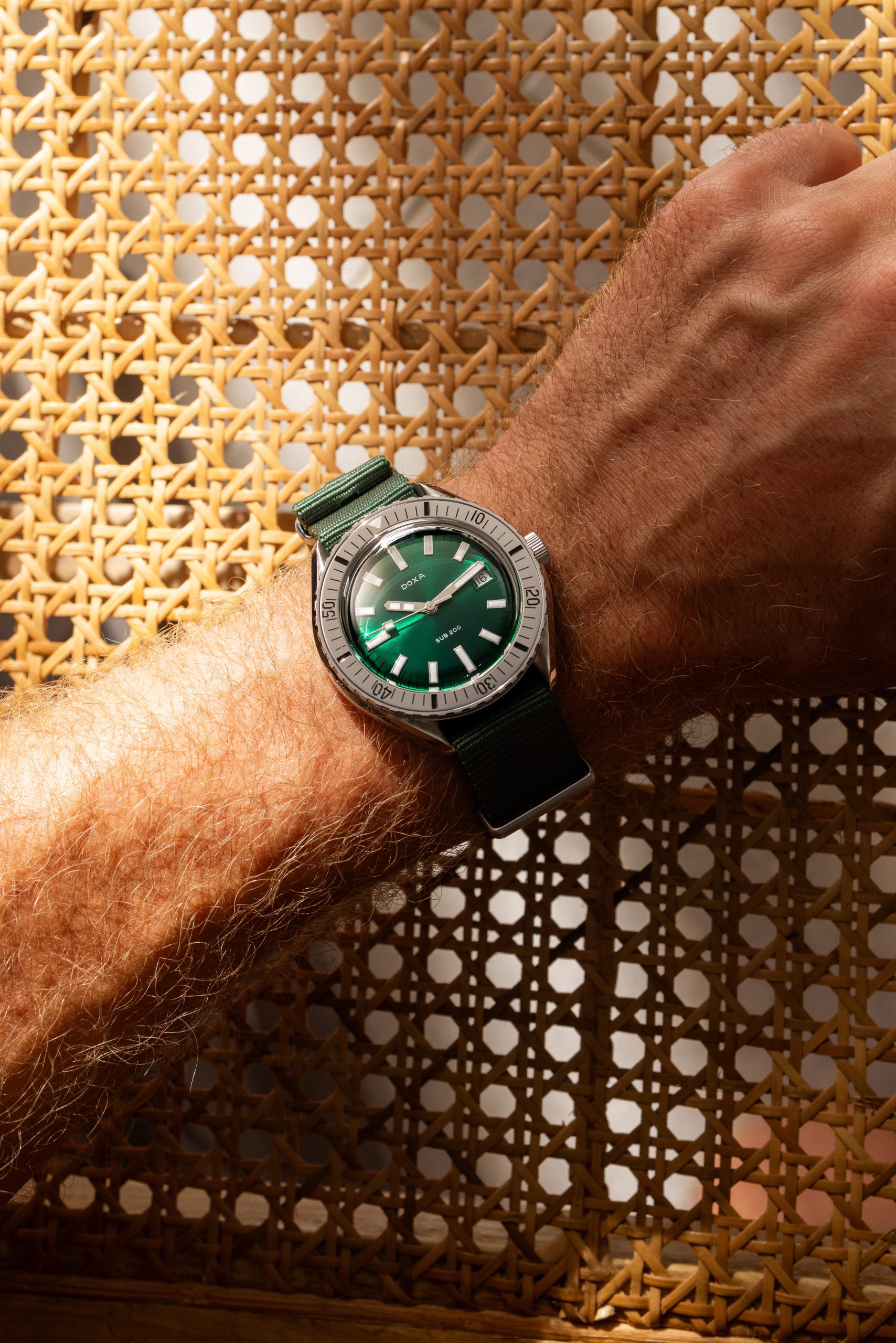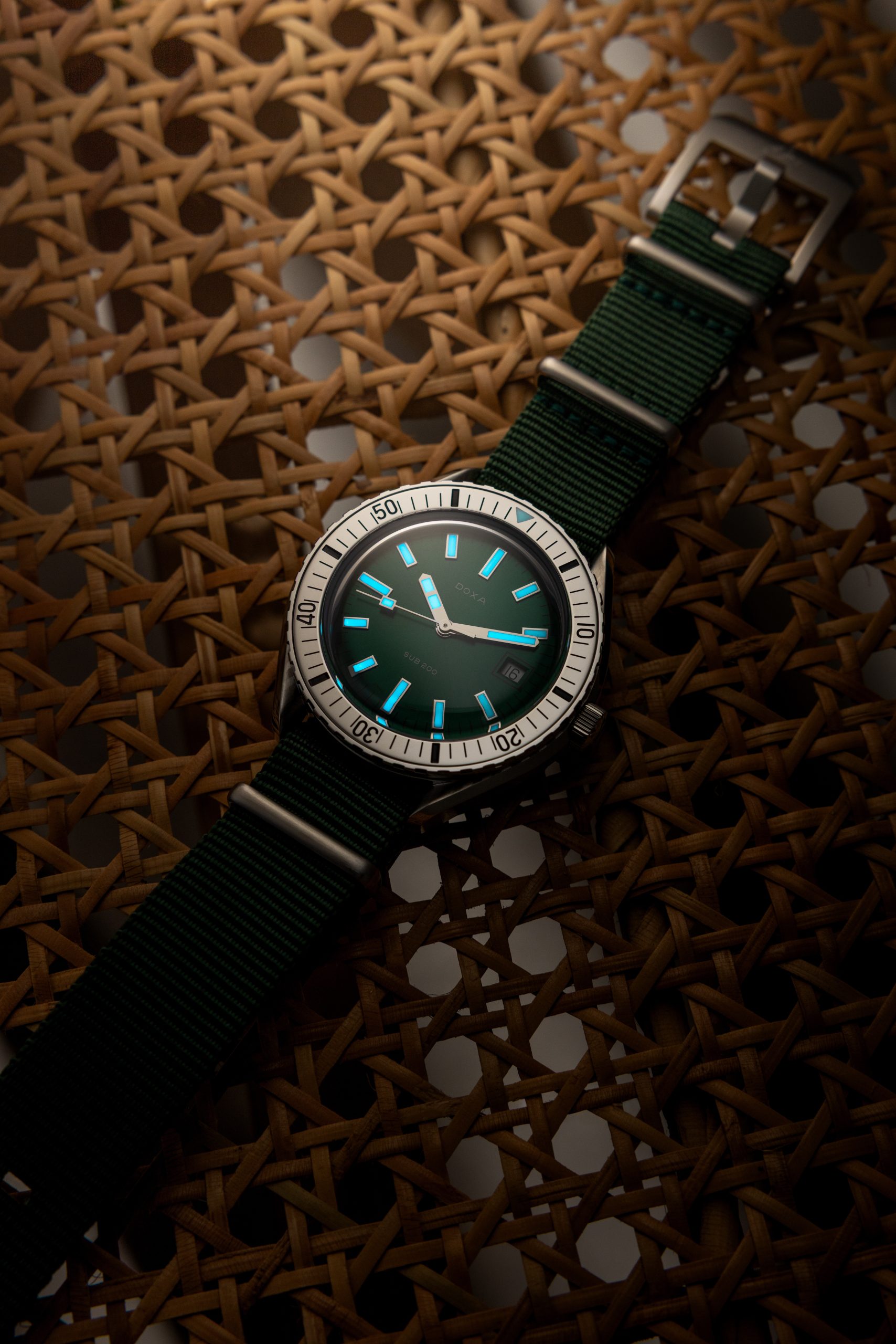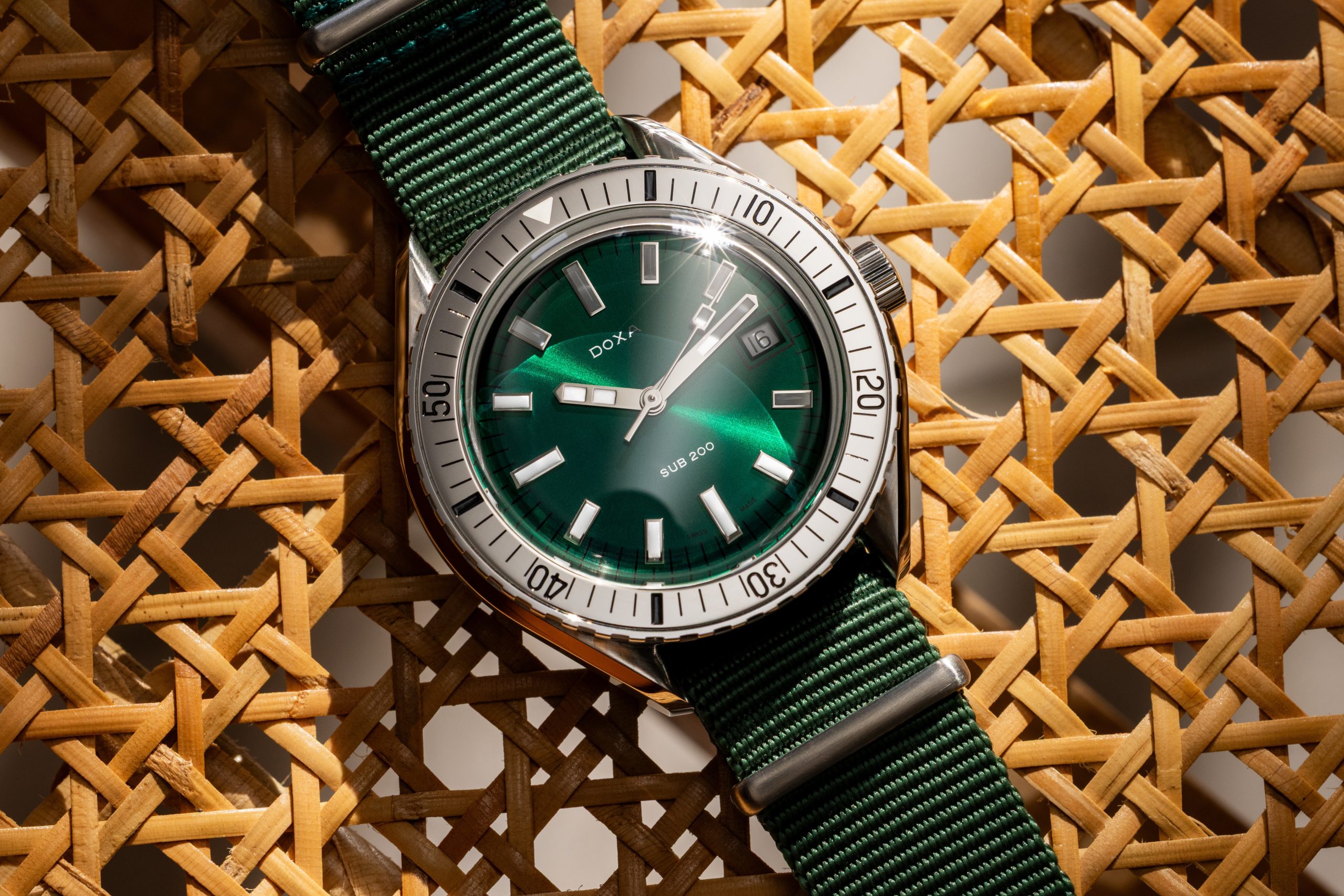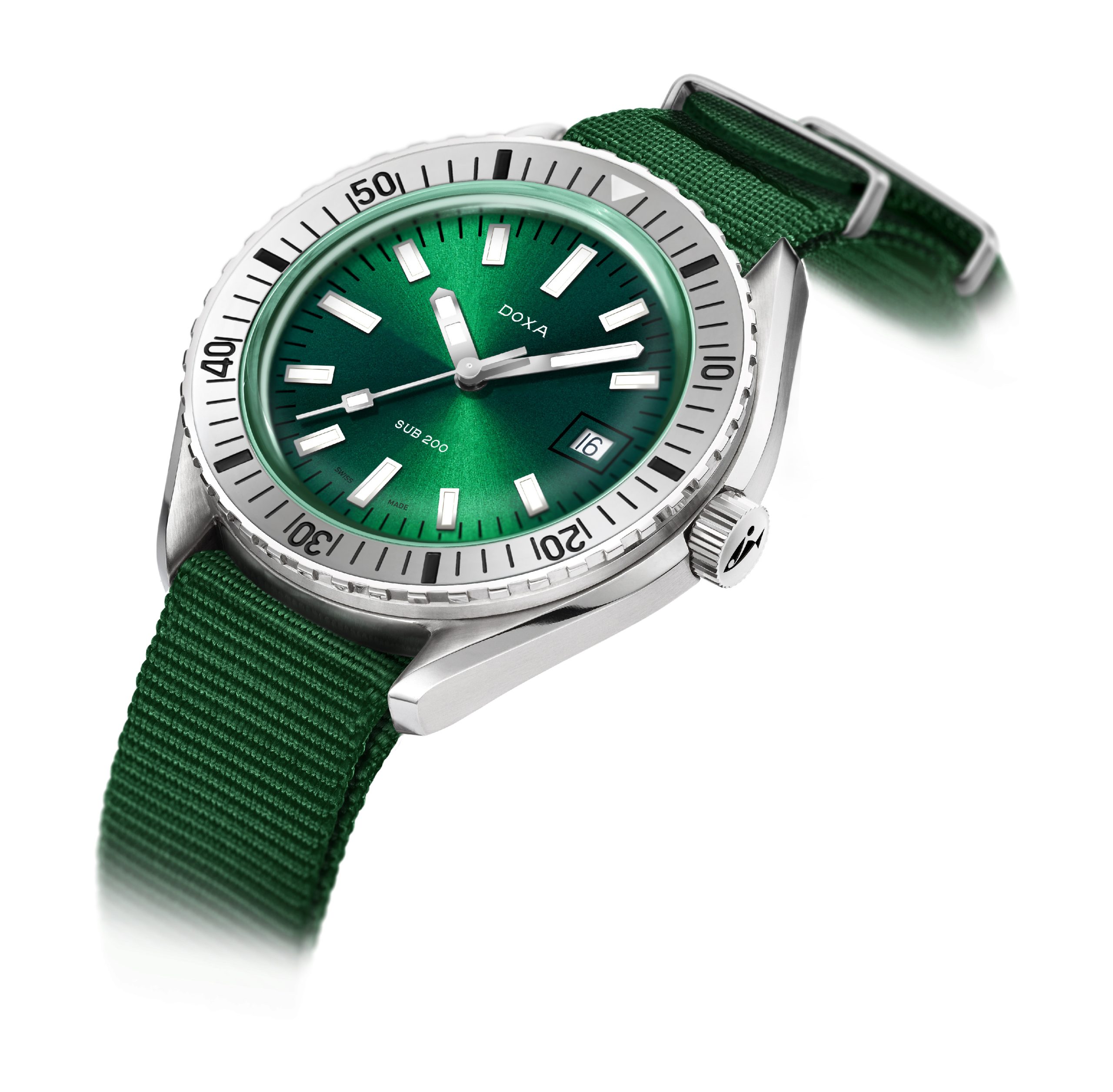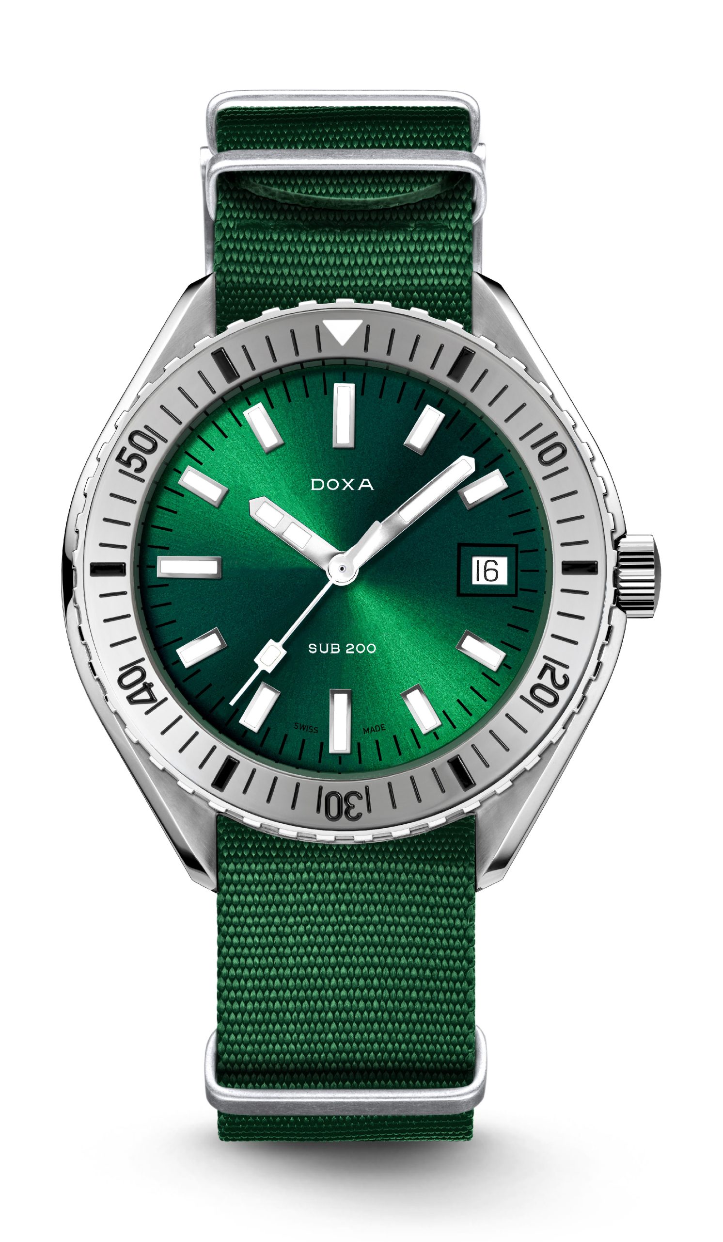 Available across all eight signature DOXA colorways, the new SUB 200 arrives on rubber, classic beads-of-rice stainless steel, or a NATO strap (exclusively for the Sea Emerald edition).