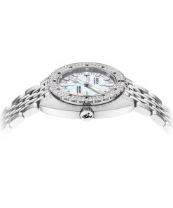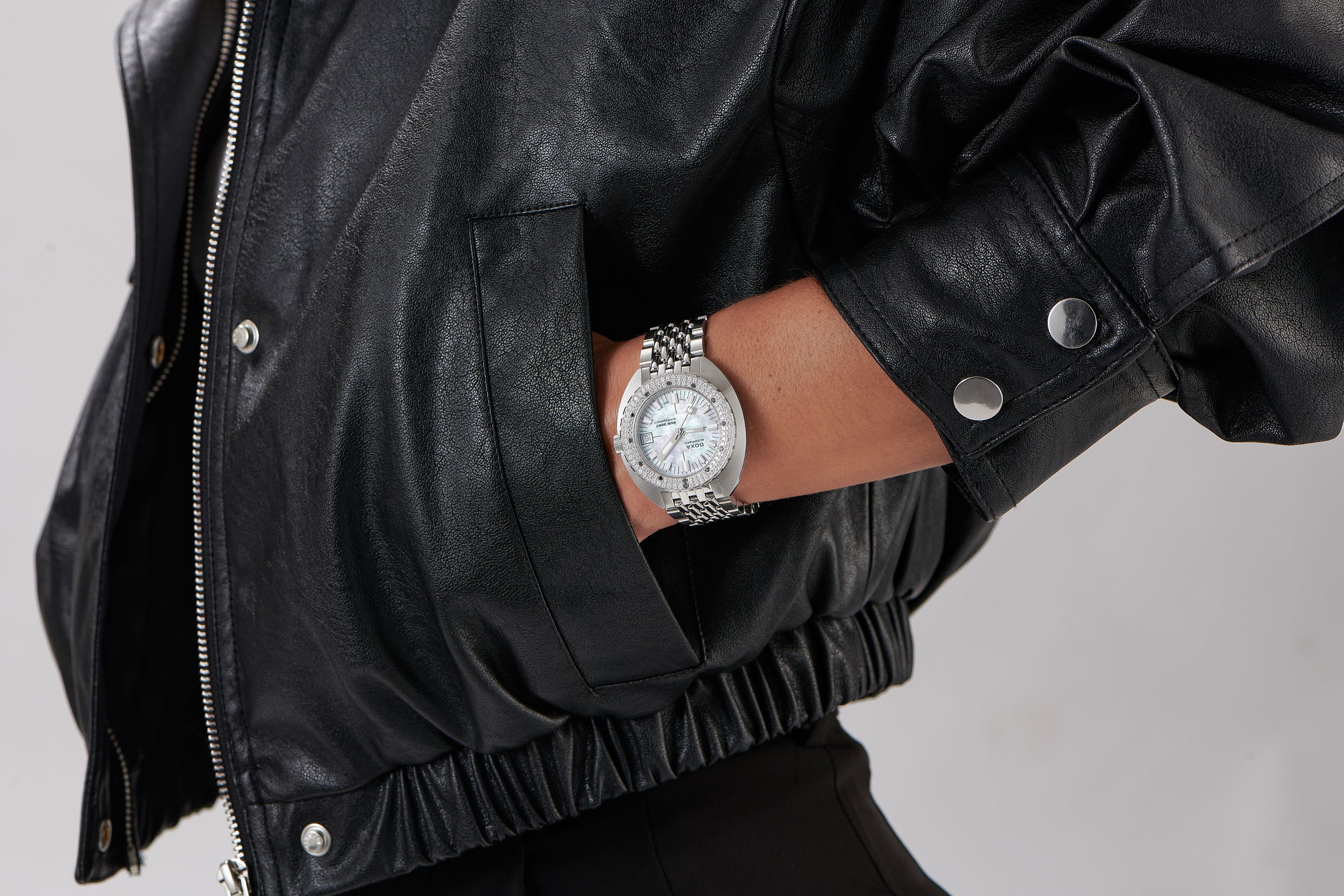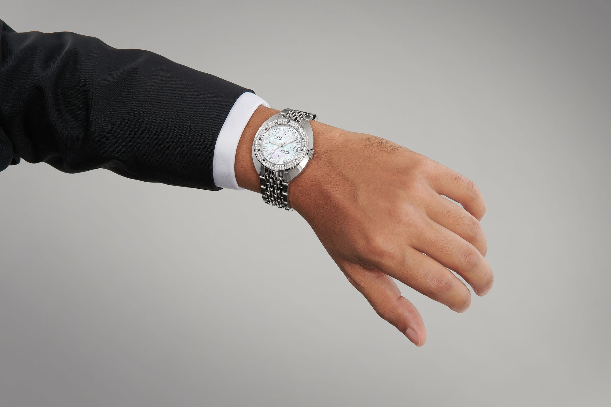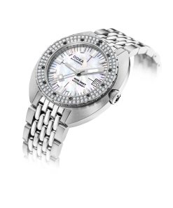 The DOXA SUB 200T Diamonds watches have been redesigned with a compact 39mm stainless steel case, a Swiss automatic movement, and a 200-meter water resistance. The mother-of-pearl dials add a bespoke touch, as no two are alike, and the luminescent Super-LumiNova® ensures readability in all conditions. DOXA’s signature ‘beads of rice’ bracelet complete the look, combining rugged durability with sophistication.