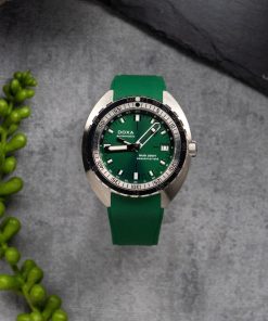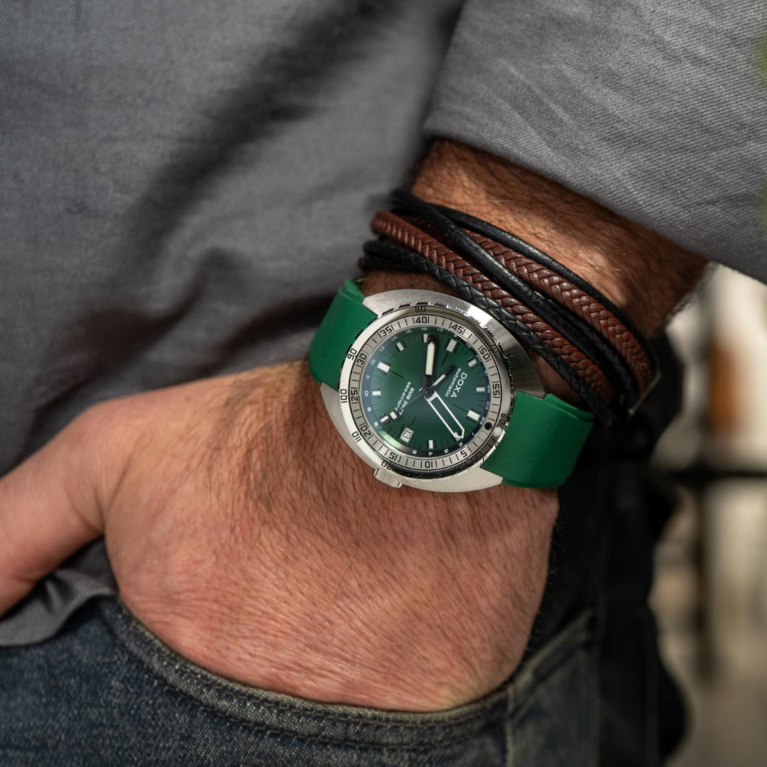 Echoing the spirit of the SUB 750T GMT from 2006, this latest evolution honors DOXA’s rich history with an added layer of technical sophistication. It’s available in nine signature colorways—from the iconic Professional orange to the sleek black Sharkhunter and the new vintage-style gradient dial—a first for DOXA, featured in the special Sharkhunter Vintage edition. The watch is available on a comfortable FKM rubber strap or the brand’s hallmark “beads of rice” stainless steel bracelet, both equipped with a diver’s extension.