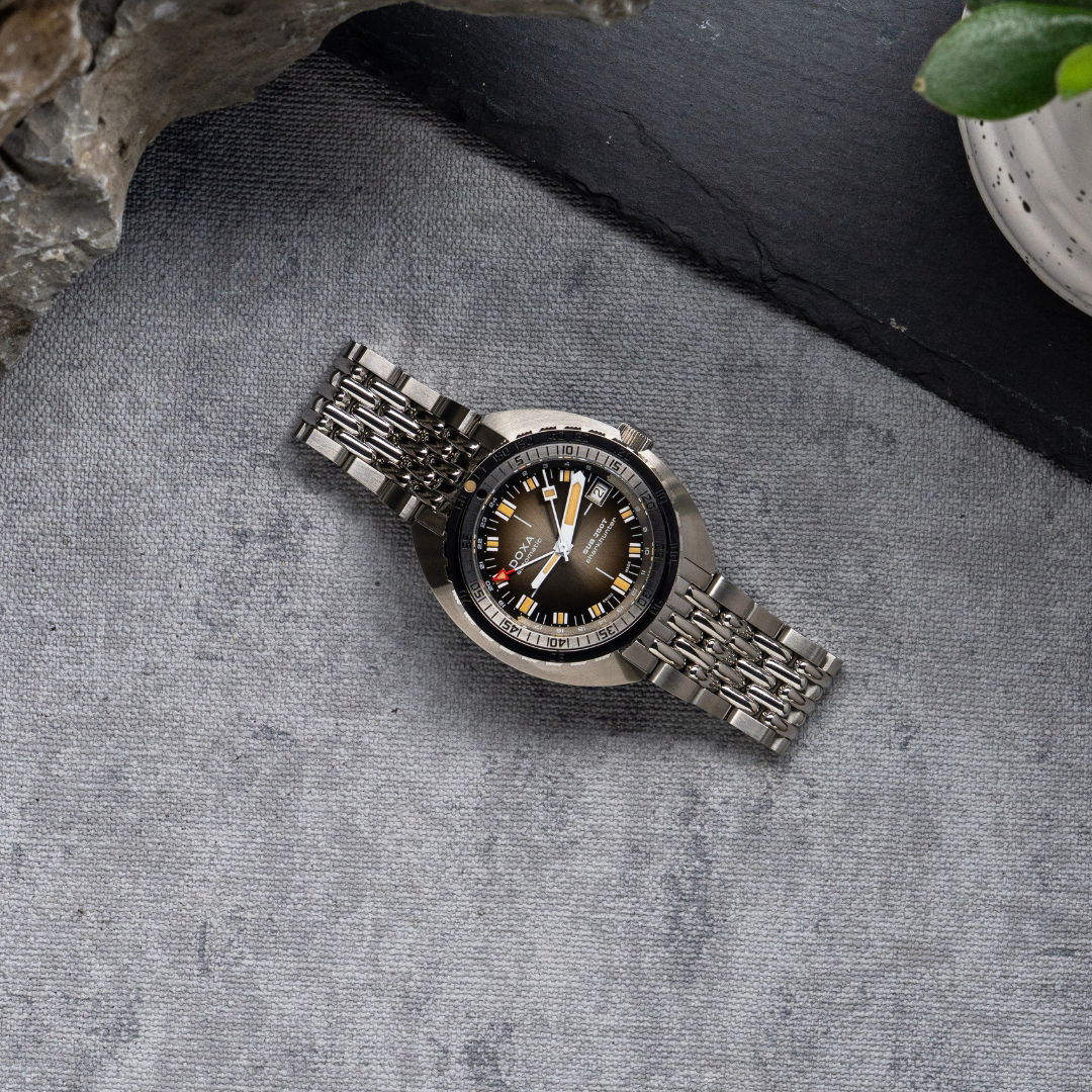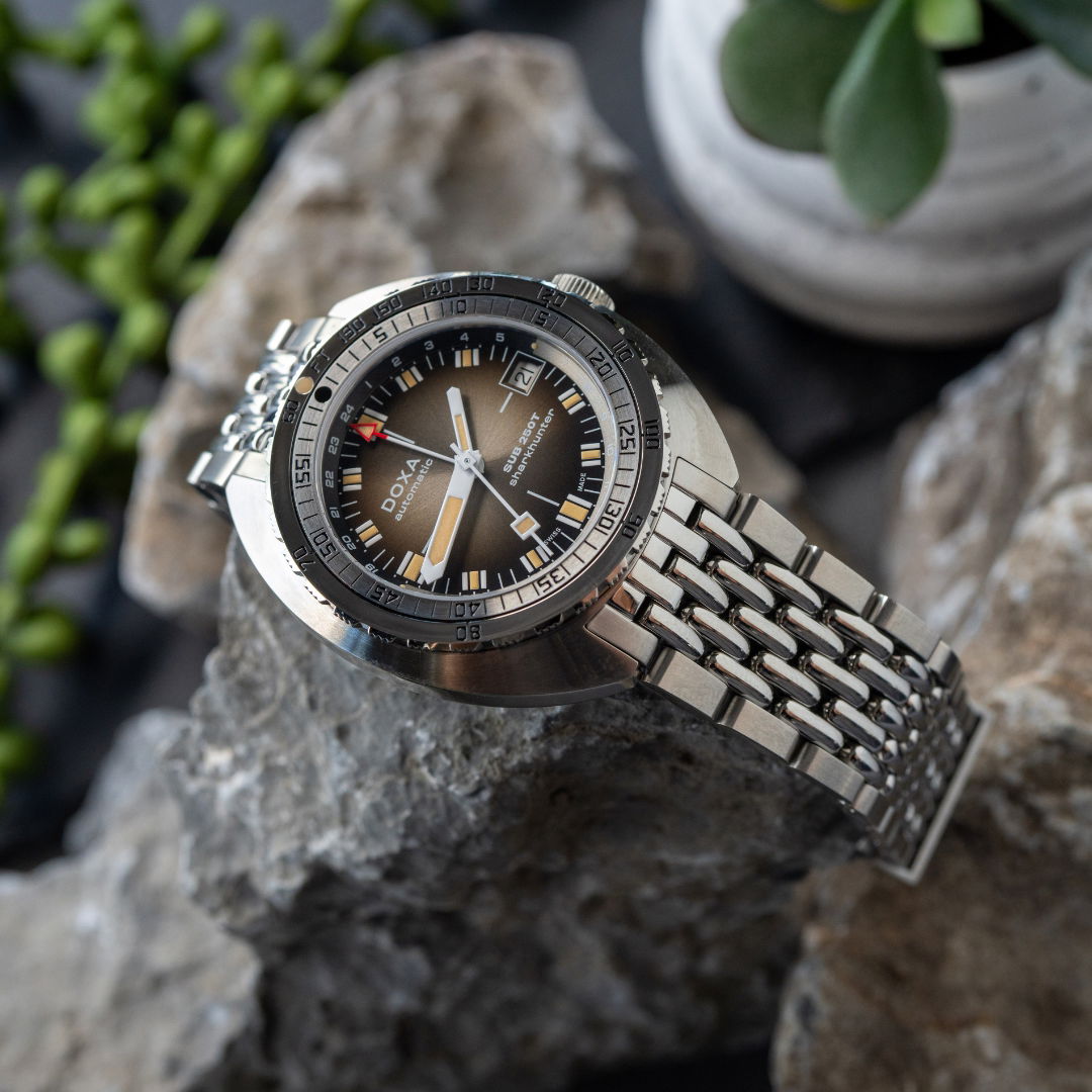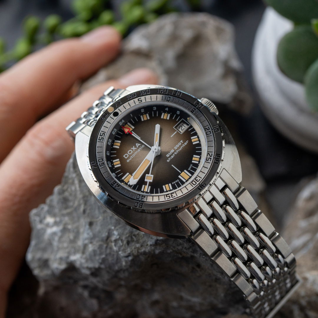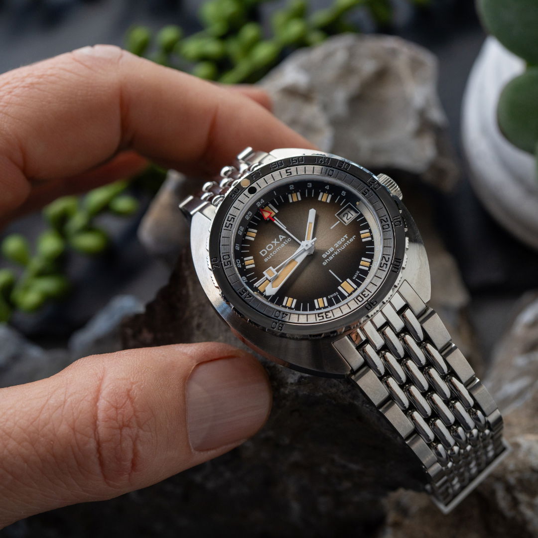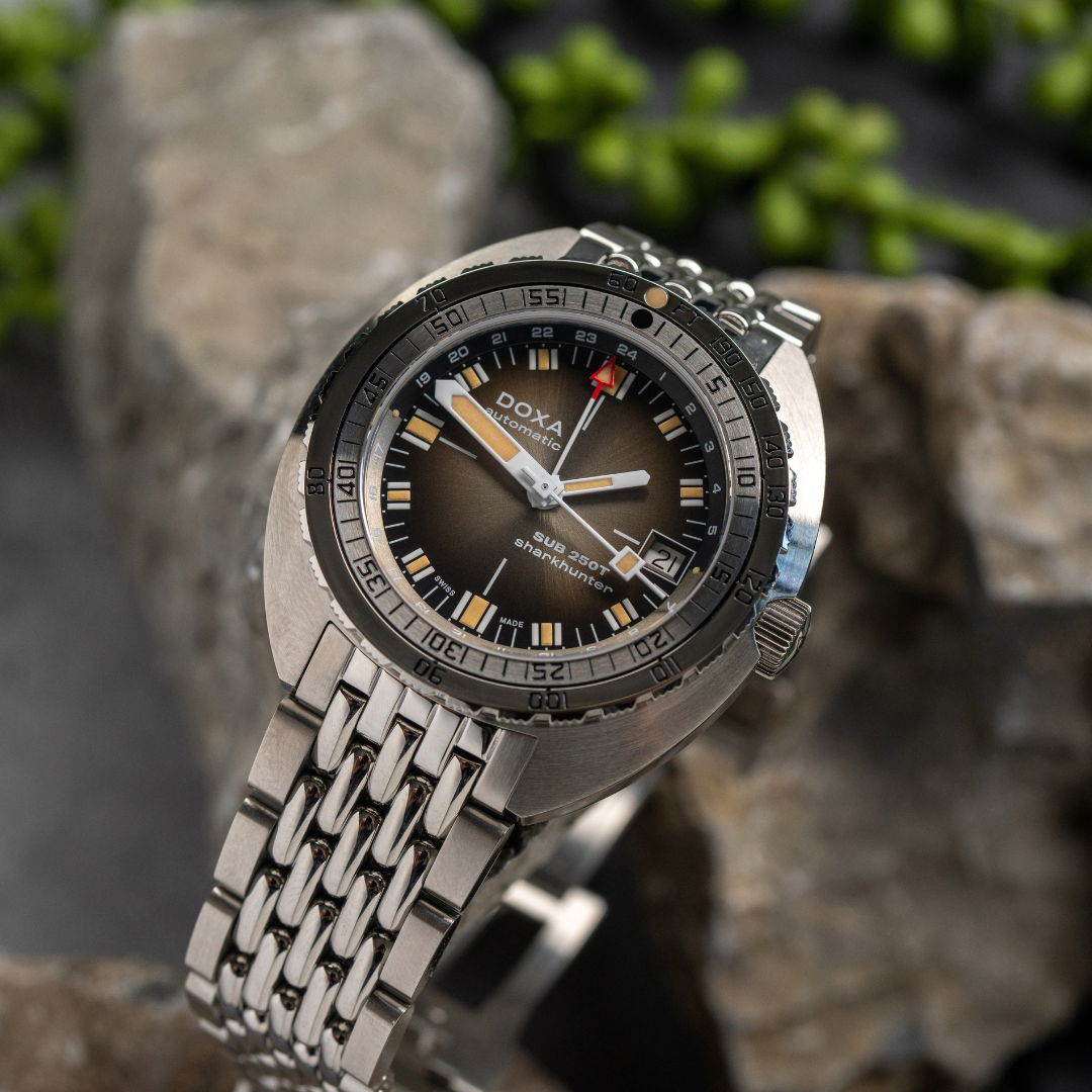 Echoing the spirit of the SUB 750T GMT from 2006, this latest evolution honors DOXA’s rich history with an added layer of technical sophistication. It’s available in nine signature colorways—from the iconic Professional orange to the sleek black Sharkhunter and the new vintage-style gradient dial—a first for DOXA, featured in the special Sharkhunter Vintage edition. The watch is available on a comfortable FKM rubber strap or the brand’s hallmark “beads of rice” stainless steel bracelet, both equipped with a diver’s extension.