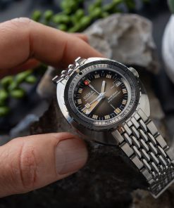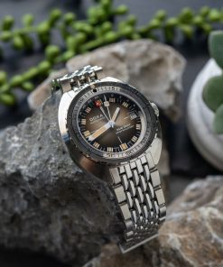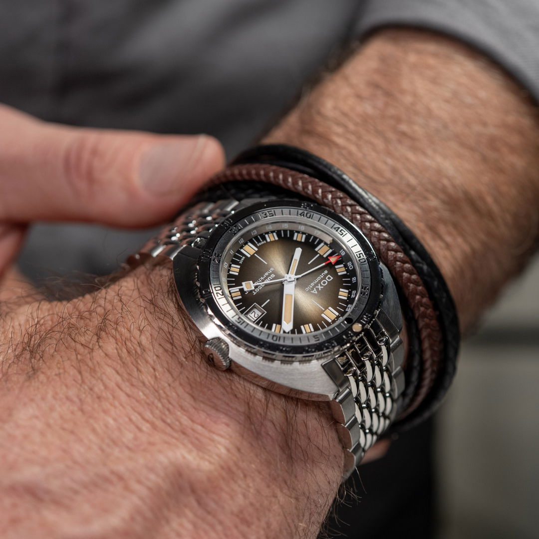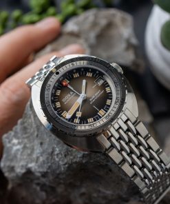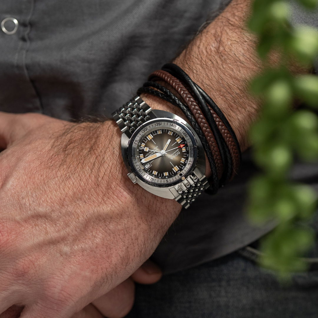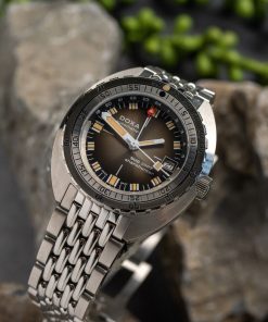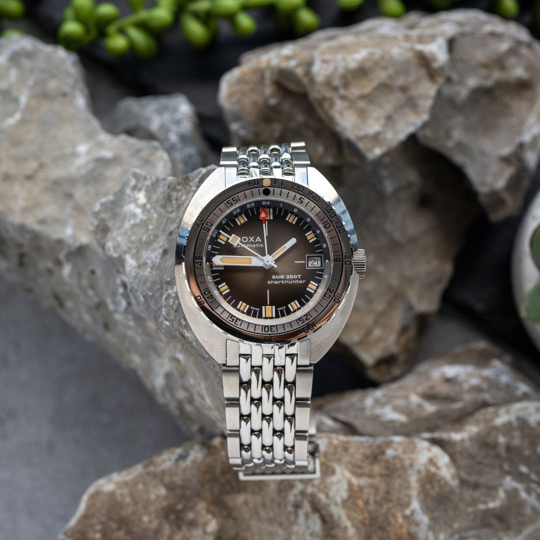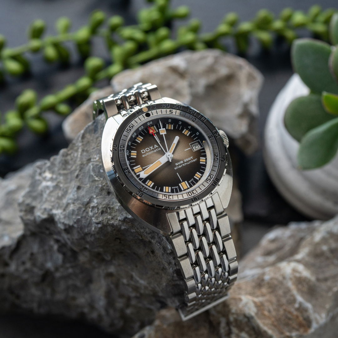 Echoing the spirit of the SUB 750T GMT from 2006, this latest evolution honors DOXA’s rich history with an added layer of technical sophistication. It’s available in nine signature colorways—from the iconic Professional orange to the sleek black Sharkhunter and the new vintage-style gradient dial—a first for DOXA, featured in the special Sharkhunter Vintage edition. The watch is available on a comfortable FKM rubber strap or the brand’s hallmark “beads of rice” stainless steel bracelet, both equipped with a diver’s extension.