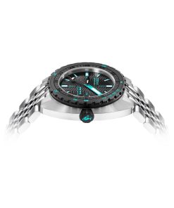The new SUB 300β by DOXA combines the robust features of a sports watch with an elegant design. It retains the 42.5 mm diameter but has a slimmer profile at 11.95 mm, compared to the SUB 300T’s 13.65 mm, and a slightly lower bezel height. The SUB 300β features a stainless steel case with a black ceramic bezel and a screw-down crown, embodying a sport-chic character. Its sunburst dial with a subtle wave motif creates a radiant effect, complemented by clear hands, hour markers, and a date display.