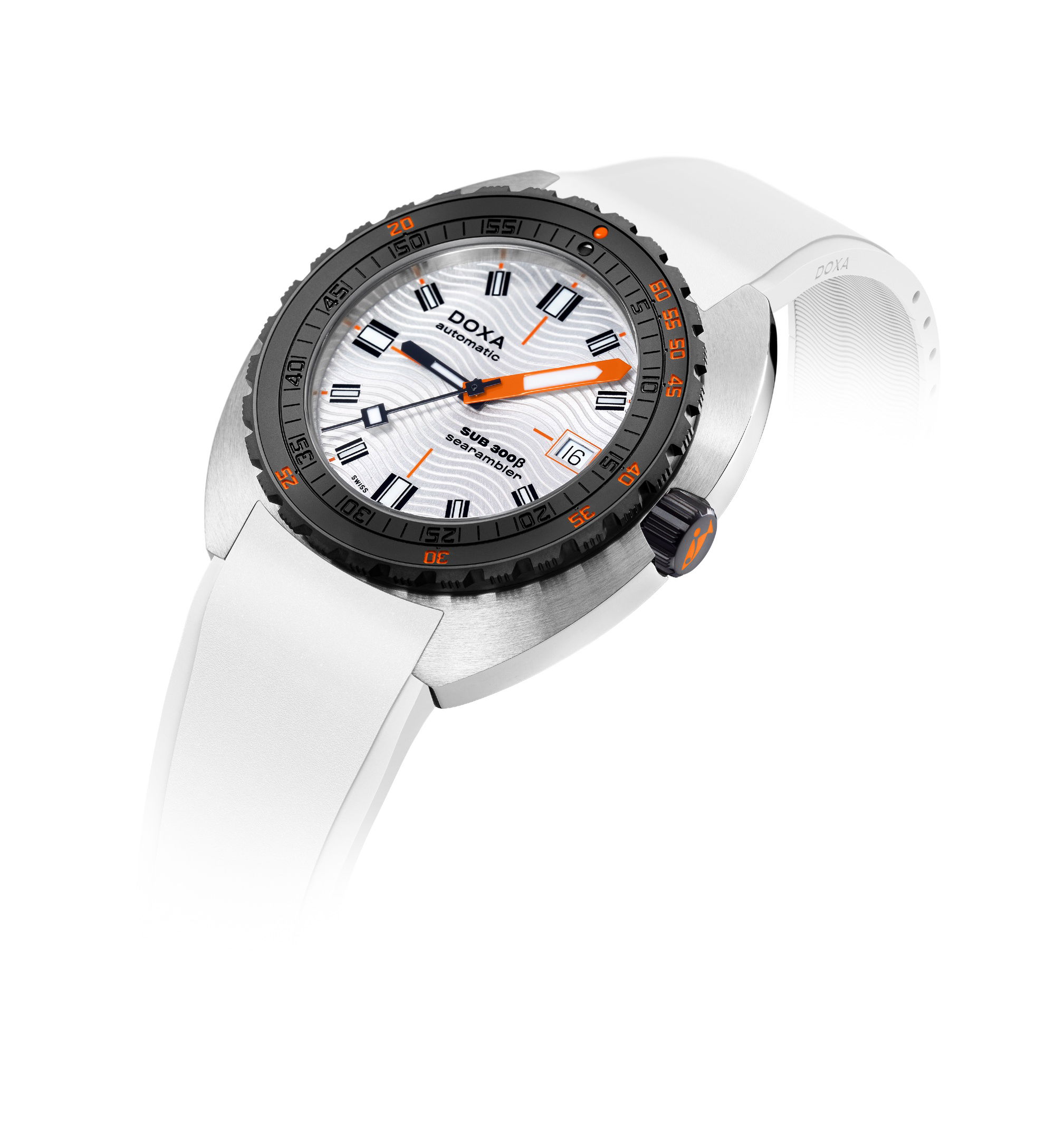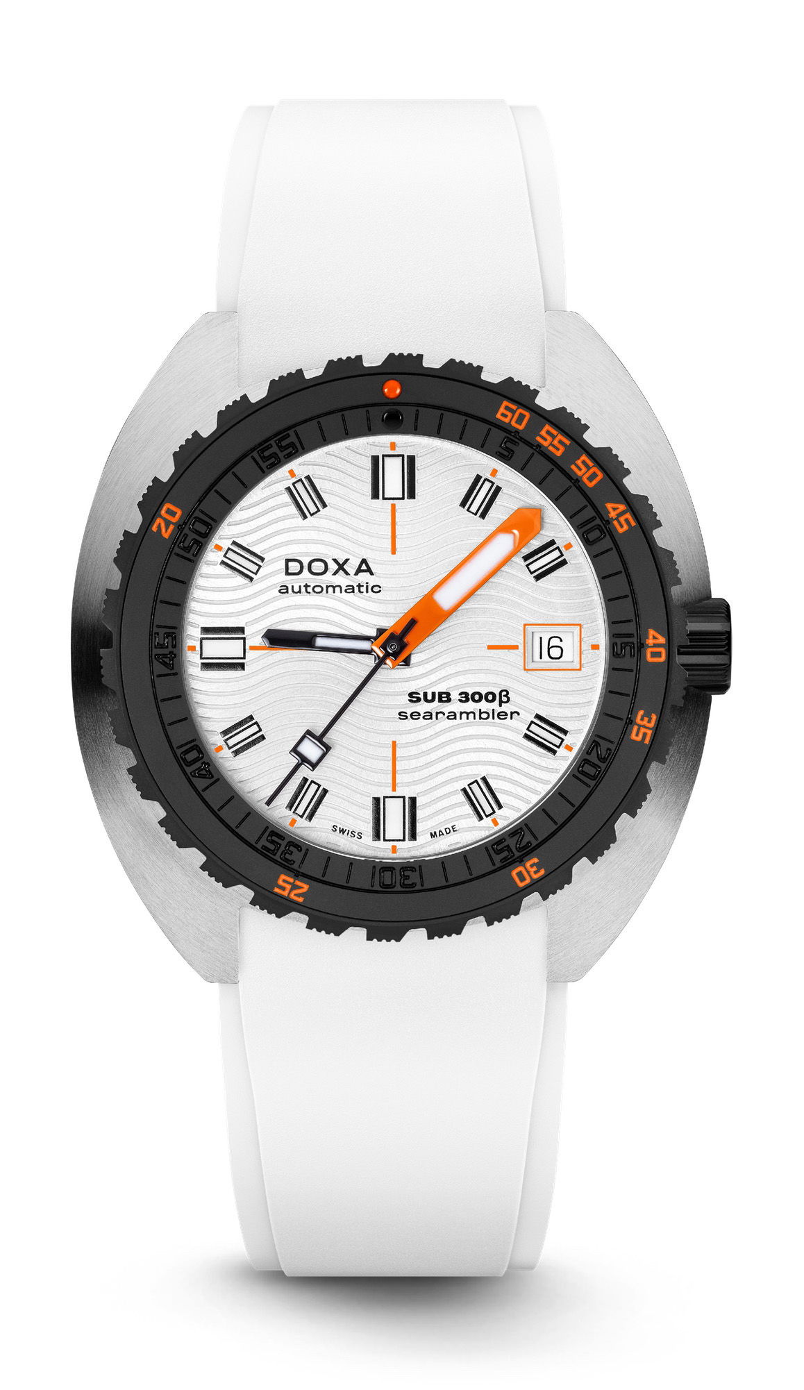 The new SUB 300β by DOXA combines the robust features of a sports watch with an elegant design. It retains the 42.5 mm diameter but has a slimmer profile at 11.95 mm, compared to the SUB 300T’s 13.65 mm, and a slightly lower bezel height. The SUB 300β features a stainless steel case with a black ceramic bezel and a screw-down crown, embodying a sport-chic character. Its sunburst dial with a subtle wave motif creates a radiant effect, complemented by clear hands, hour markers, and a date display.