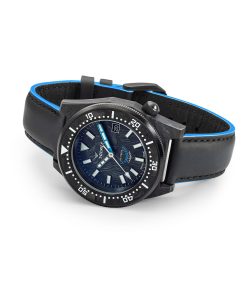 Despite its modern shell, the T-183 stays true to Squale’s diving roots. It’s rated to 600 metres of water resistance, with a helium escape valve and screw-down crown, making it a serious tool for underwater use. The dial is clean and legible, with bold markers and hands filled with Super-LumiNova for visibility in the dark. Available in blue, yellow or red accents, the coloured details add energy without going over the top. Paired with a matching rubber strap, it’s ready for action.