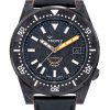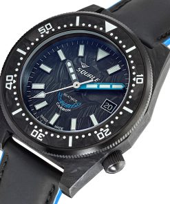 The Squale T-183 Forged Carbon is a bold departure from the brand’s usual vintage dive look, pushing into modern, almost futuristic territory. Its case is made from forged carbon, a high-tech material known for being both strong and ultra-light, giving each watch a unique marbled pattern. At 42mm wide and just under 15mm thick, it wears solidly on the wrist but feels lighter than it looks. A ceramic bezel and sapphire crystal round out the durable, scratch-resistant build.