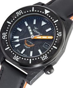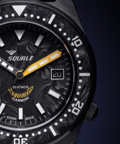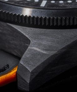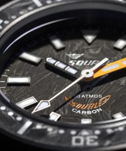 The Squale T-183 Forged Carbon is a bold departure from the brand’s usual vintage dive look, pushing into modern, almost futuristic territory. Its case is made from forged carbon, a high-tech material known for being both strong and ultra-light, giving each watch a unique marbled pattern. At 42mm wide and just under 15mm thick, it wears solidly on the wrist but feels lighter than it looks. A ceramic bezel and sapphire crystal round out the durable, scratch-resistant build.