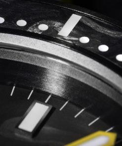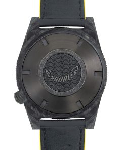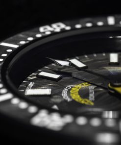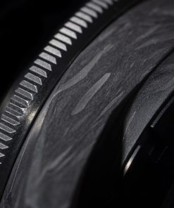 The Squale T-183 Forged Carbon is a bold departure from the brand’s usual vintage dive look, pushing into modern, almost futuristic territory. Its case is made from forged carbon, a high-tech material known for being both strong and ultra-light, giving each watch a unique marbled pattern. At 42mm wide and just under 15mm thick, it wears solidly on the wrist but feels lighter than it looks. A ceramic bezel and sapphire crystal round out the durable, scratch-resistant build.