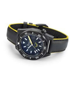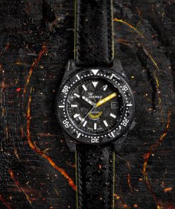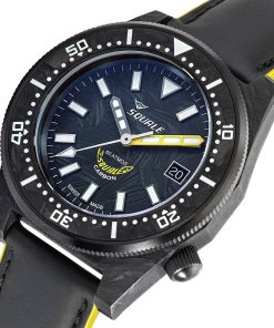 Despite its modern shell, the T-183 stays true to Squale’s diving roots. It’s rated to 600 metres of water resistance, with a helium escape valve and screw-down crown, making it a serious tool for underwater use. The dial is clean and legible, with bold markers and hands filled with Super-LumiNova for visibility in the dark. Available in blue, yellow or red accents, the coloured details add energy without going over the top. Paired with a matching rubber strap, it’s ready for action.