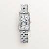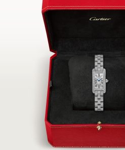 Tank Américaine watch, mini model, quartz movement. White gold 750/1000 case and faceted crown set with 41 brilliant-cut diamonds totaling 0.69 carats. Silvered sunray dial, blued-steel sword-shaped hands, sapphire crystal. White gold 750/1000 strap set with 528 brilliant-cut diamonds totaling 2.60 carats, rose gold 750/1000 ardillon buckle. Case dimensions: 28 mm x 15.2 mm, thickness: 6.5 mm. Water-resistant up to 3 bar (approx. 30 meters/100 feet).