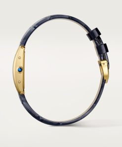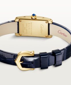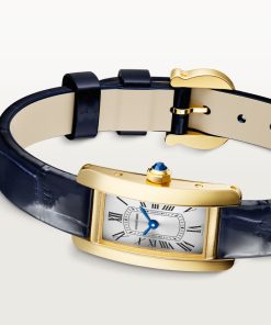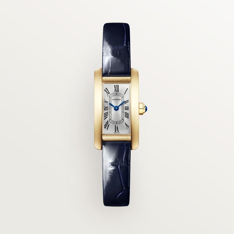Tank Américaine watch, mini model, quartz movement. 18K yellow gold (750/1000) case, faceted crown set with a faceted sapphire. Satin-brushed silvered dial with sunray effect, blued-steel sword-shaped hands, sapphire crystal. Shiny navy blue alligator leather strap, 18K yellow gold (750/1000) ardillon buckle. Case dimensions: 28 mm x 15.2 mm, thickness: 6.5 mm. Water-resistant up to 3 bar (approx. 30 meters/100 feet).