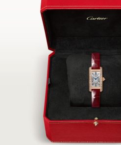 Tank Américaine watch, mini model, quartz movement. 18K rose gold (750/1000) case and faceted crown set with 31 brilliant-cut diamonds totaling 0.55 carats. Silvered sunray dial, blued-steel sword-shaped hands, sapphire crystal. Shiny red alligator-skin strap, 18K rose gold (750/1000) ardillon buckle. Case dimensions: 28 mm x 15.2 mm, thickness: 6.5 mm. Water-resistant up to 3 bar (approx. 30 meters/100 feet).