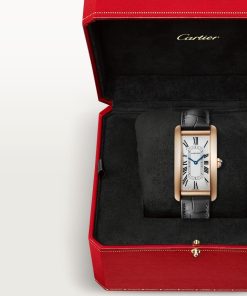 Tank Américaine watch, large model, mechanical movement with automatic winding. 18K rose gold (750/1000) case, faceted crown set with a faceted sapphire. Satin-brushed silvered dial, blued-steel sword-shaped hands, sapphire crystal. Semi-matte gray alligator-skin strap, interchangeable 18K rose gold (750/1000) folding buckle. Case dimensions: 44.4 mm x 24.4 mm, thickness: 8.6 mm. Water-resistant up to 3 bar (approx. 30 meters/100 feet)