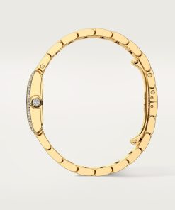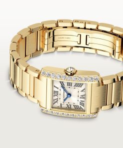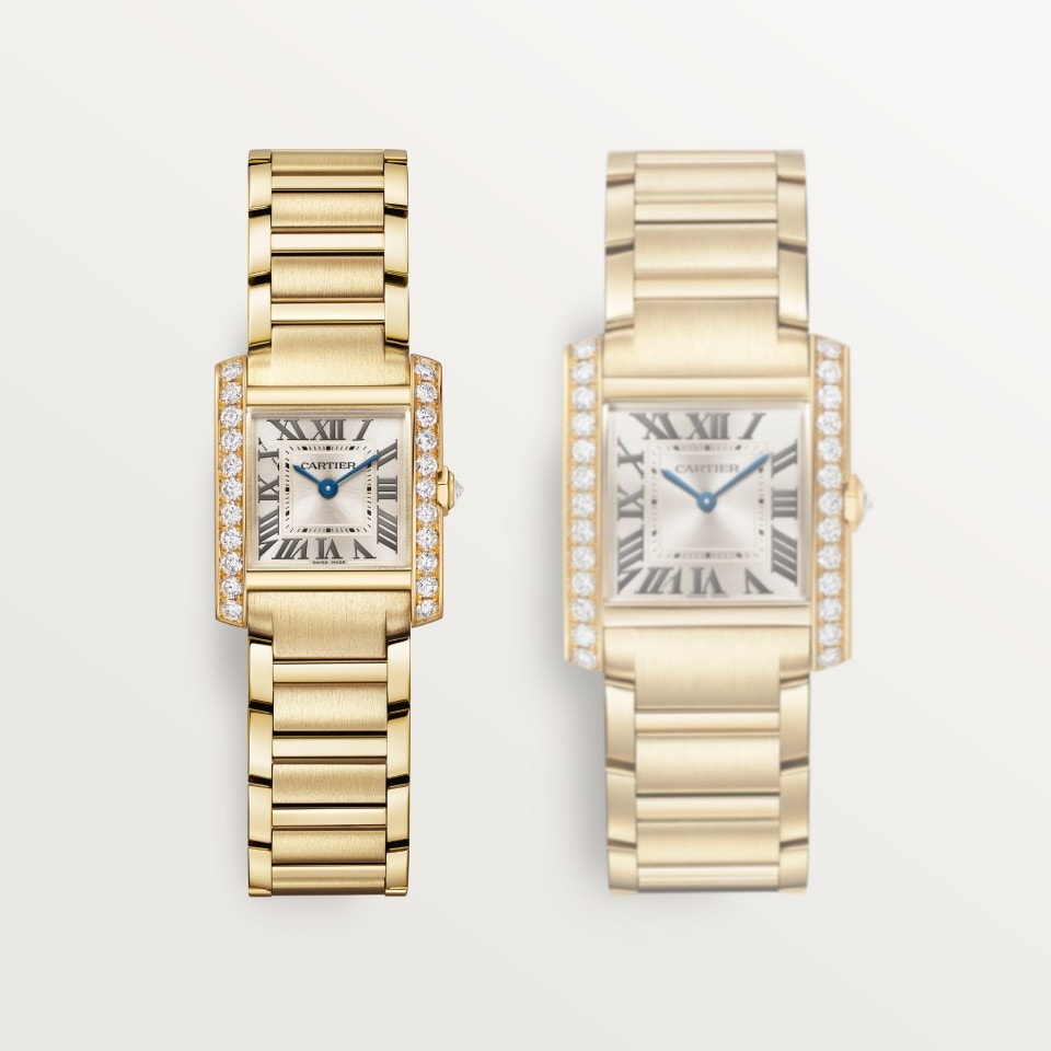 Tank Française watch, small model, quartz movement. Case and faceted crown in 18K yellow gold (750/1000) set with 23 brilliant-cut diamonds totaling 0.78 carats. Golden sunray dial, blued-steel sword-shaped hands, sapphire crystal. Bracelet in 18K yellow gold (750/1000). Case dimensions: 25.7 mm x 21.2 mm, thickness: 6.8 mm. Water-resistant up to 3 bar (approx. 30 meters/100 feet).